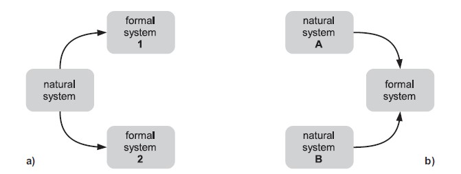 In an abstract scientific sense, modelling is a coding process and creates a relation between a ‘natural’ and a ‘formal’ system (Figure 1a; Rosen 1985). As scientists refine existing and construct new theories, there may (temporarily) be two different formal systems to describe the same natural system. An example of such complementarity is the wave and the particle description of light. Conversely, two different natural systems may apparently be so much alike that they can be described with a single model. They are analogies or, if the isomorphism is rather loose, metaphors (Figure 1b).