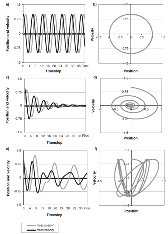 The system has three attractors, two stable and one unstable. A steel spring placed between two permanent magnets is a bistable oscillator described by these equations (Bossel 1994). If there is no dampening (r = 0), the system oscillates between the two attractors, as shown in the trajectory in time and in the phase diagram in Figure 1g–h. The damped system moves towards one of the two attractors, but it is hard to say in advance to which one. A slight uncertainty or change in the initial state, that is, x at t = 0, or in one of the parameters can make the system move towards a different equilibrium state – it is extremely sensitive to the initial conditions. The term ( – 1) introduces a nonlinearity. This usually leads to multiple equilibria and critical dependence on the initial conditions. These simple technical devices show complex behaviour.