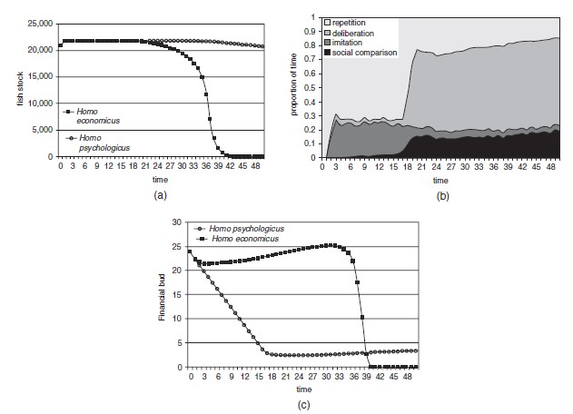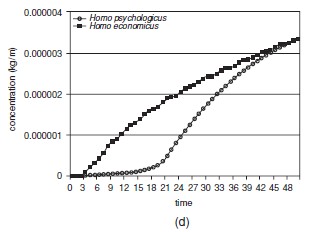 The consumats can satisfy their personal needs by exploiting two natural resources: fish and gold. Which strategy a consumat chooses depends on present and past levels of need satisfaction and uncertainty. The four options are shown in Figure 14.12. For instance, if a consumat is satisfied and highly uncertain, she will resort to automated socially determined behaviour. Each consumat updates every timestep in the simulation his memory with information on his own and other agents’ performance. Allocating time and money, it leads to certain levels of needs satisfaction and uncertainty. The needs considered are proxies for leisure, identity, subsistence and freedom What can we learn from this model about sustainable development? Development in Lakeland happens because agents switch strategy if their performance falls below the expectation they build up in their memory. They are in a social dilemma situation: each consumat is inclined to get as much income at the lowest effort possible, but in doing so they may collectively destroy the option to sustain income and quality of life for the long term. Some illustrative outcomes are shown in Figure 14.13. To keep the analysis transparant, two archetypical consumats are defined: the Homo economicus (He) and the Homo psychologicus (Hp). The former favours deliberation, because he operates with high levels of need satisfaction and uncertainty reduction. The latter is quickly satisfied and an uncertain imitator. Let us assume fishing is the only option. If initially everyone is a rational deliberator He, the fish stock is depleted before year 40 (Figure 14.13a). The Hp, On the other hand, if everyone is happy to spend their time as lazy, poor repetitors and imitators until the initial budget is spent, many of them become unsatisfied (in year 18) and switch to deliberate behaviour in order to restore income (Figure 14.13b). As a consequence, the fish stock will still be depleted but much later (Figure 14.13a,b). The two consumat-types have a very different financial budget profile and in the He-collapse period there are large income differences amongst the agents (Figure 14.13c). If uncertainty is completely removed, the He does not overharvest and the Hp spends even less time fishing. This is in agreement with the finding that uncertainty tends to cause resource overexploitation (May 1977). Figure 1a-c. Illustrative pathways in a fishing-only no-gold-mining consumat world for the Homo economicus (He) and Homo psychologicus (Hp) in the first 50 timesteps (averages for 100 simulation runs) (Jager et al. 2000). (a) The fish stock, (b) the proportion of time spent in one of the four strategies (c), the financial budget. If the consumats can engage in gold mining as an additional source of income, a transition happens from a fishing into a mining community for both He and Hp. Both do pollute the lake, with a negative impact on the fish stock (Figure 14.13d). The He are keen to grasp the new income opportunity and the fish stock is less intensely exploited. The Hp switch at a slower rate to mining, suffer more from pollution impacts and are forced into an accelerated transition to mining. Both development pathways show the same irreversible transition towards mining and a degraded environment – a story that can be told for many places on earth. Figure 2. Illustrative pathway of the pollutant concentration in the lake in a fishing and gold-mining consumat world for the Homo economicus and Homo psychologicus in the first 50 timesteps (averages for 100 simulation runs) (Jager et al. 2000). In the Modernity worldview, such catastrophes are to be averted by discovering and implementing labour-saving innovations. So what happens if an innovative deliberating consumat increases his productivity (fish caught per hour)? In a world dominated by He, the innovation makes one individual more productive than others and it rapidly spreads in this competitive and entrepreneurial world through imitation. As a consequence, the fish stock is depleted faster than without the innovation. This is precisely what happened when fishing boats became more effective. It illustrates the ambiguity of technology: innovations in resource exploitation are both cause and solution of sustainability problems. What happens when the world is dominated by Hp? Nothing, really: he is easily satisfied (is he lazy?) and does not engage in deliberation (is he stupid?). [1] These needs are supposed to play an important role and are selected out of a larger set of needs, as described by Max-Neef (1991) (§6.2). —