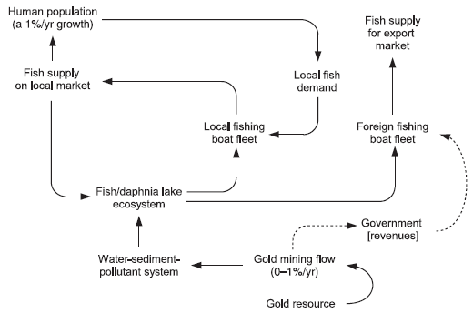The country consists of two subsystems: a lake or coastal area with fish and their food – say, daphnia, a kind of water flea – and the economy of people, fishing boats and a reserve of mineral ore with high gold content (Figure 1). The Lakelanders get their food from fishing in the local lake and make their boats and nets from local materials. There are only two capital stocks: boats and nets, and mining equipment. They change because of investment and depreciation, with the latter assumed to be inversely proportional to the economic lifetime. The demand for fish is growing over time because of population growth. This means more boats and nets. Therefore, you can make three reasonable assumptions about the fishermen behaviour and the ecosystem: