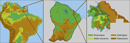 Figure 9.6. Nature reserves in North French-Guiana. The Tresor Reserve borders are twenty-five times bigger than Kaw-Roura (moerasbos: swamp forest, hellingbos: slope forest, natte savanne: wet savanna, plateaubos: plateau forest)