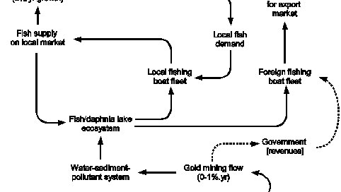 admin2015-06-04T13:21:18+00:00Figure 12.1 The Lakeland model world: a human population that sustains itself by fishing and exploiting a gold mine, and an ecosystem with a prey-predator dynamic and pollution of water and sediment.