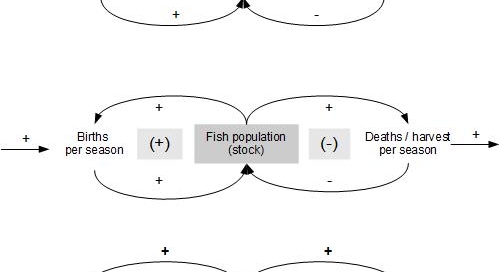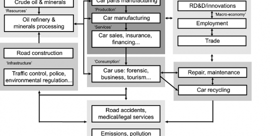 Figure 2.12. The car system and related subsystems in society"Examples of causal loop diagramas of basic dynamic processes: population growth, capital stock growth, forest growth and fossil fuel depletion.