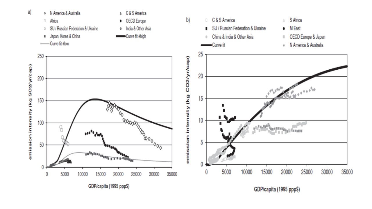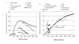 In the early 1990s, a Kuznets-type relationship was hypothesised between the per capita emission of pollutants (in t/cap/yr) and income. It is called the Environmental Kuznets Curve (EKC) hypothesis. It has been widely discussed since its proposal – see the literature list below. Early work for the World Bank Development Report in 1992 popularised the idea of an EKC to the extent that an influential economist claimed that ‘there is clear evidence that, although economic growth usually leads to environmental degradation in the early stages of the process, in the end the best – and probably the only – way to attain a decent environment in most countries is to become rich’ (Beckerman, in Stern 2004). Again, such a generalisation is not justified.
