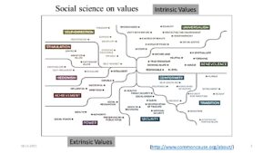 One of its representations stems from the Common Cause foundation (https://commoncausefoundation.org/) (Figure 2a). The scheme makes it possible to explore one’s values and explore positive and negative connections between them. None of these values is wrong in itself, but some values seem to make people a bit more happy than others. In this webinar, it was asked which value you aspire will make you the most happy? A two-third majority chose goodness., with universalism as a second. Pursuing goodness and being other-oriented makes you happy… Self-management and self-development are also often chosen, apparently in the belief that there is such a thing as ‘self’…